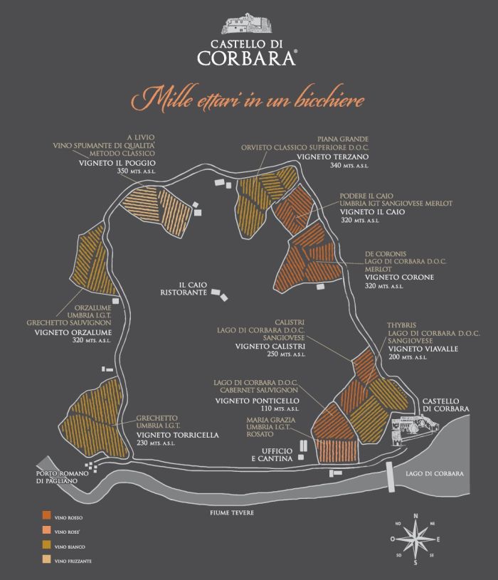 Alla fine dell’ottocento la Tenuta di Corbara divenne proprietà della Banca Romana che nel 1889/90 riportò alla luce in opus reticolatum il porto romano di Pagliano, posto sulla confluenza del Tevere e del Paglia. Tale sito archeologico assunse grande importanza storica nel quadro delle relazioni commerciali e economiche fra Roma e le zone dell’immediato retroterra e, grazie ai costanti interventi di ricerca, protezione, restauro delle strutture è oggi agibile e visitabile.L’attuale fisionomia dell’Azienda Agricola Castello di Corbara rappresenta lo specchio fedele della nuova progettualità finalizzata alla valorizzazione della produzione vitivinicola, voluta con fermezza e passione dalla Famiglia Patrizi che nel 1997 ne ha acquisito la proprietà. Tale obiettivo è stato ispirato principalmente dall’insita esigenza di recupero di valori quali il rispetto del territorio, la cui autenticità trova sempre espressione in tutti i vini prodotti.